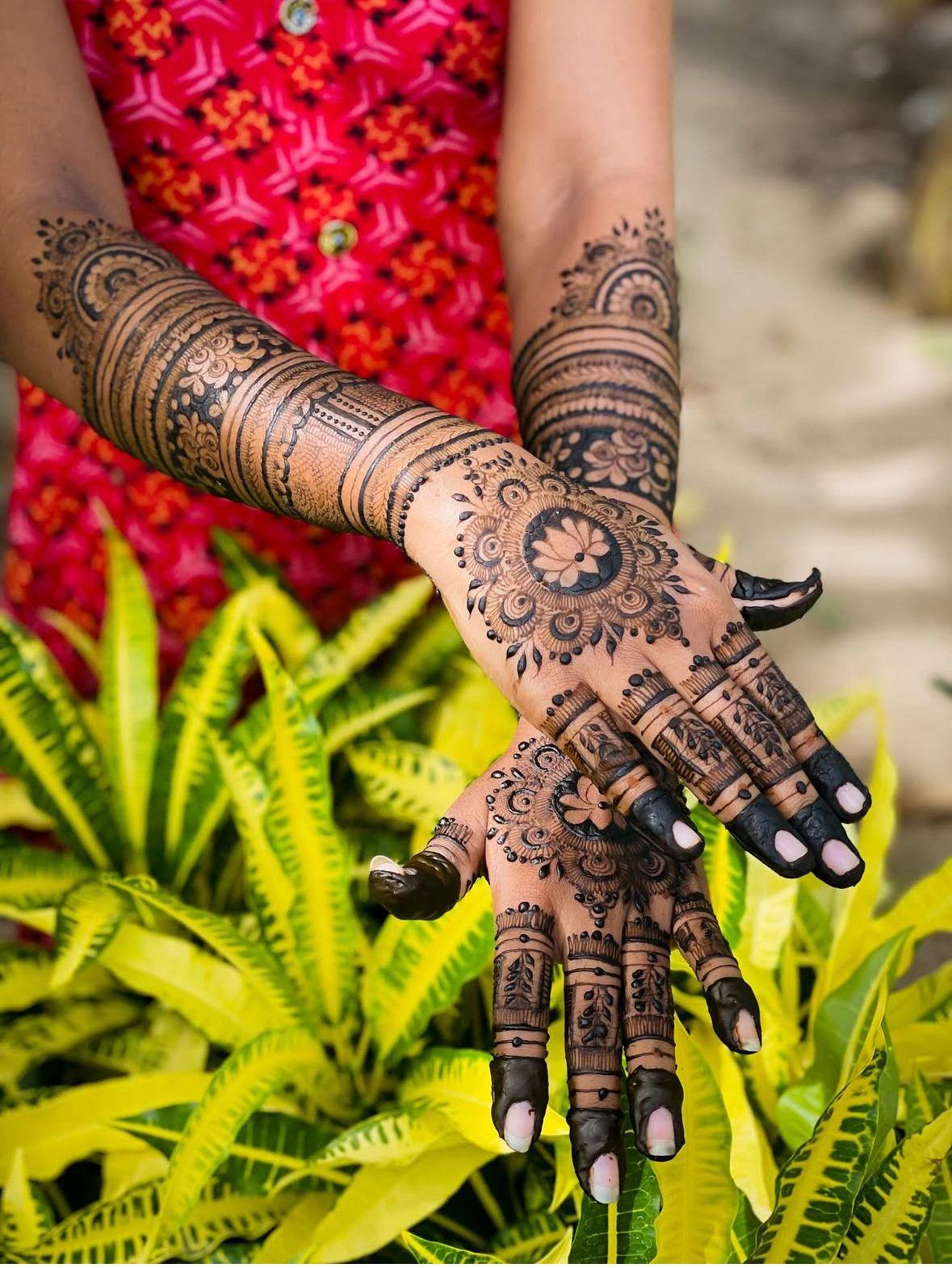 Full bridal Mehendi for hands, arms, and feet with highly detailed traditional or modern patterns.
